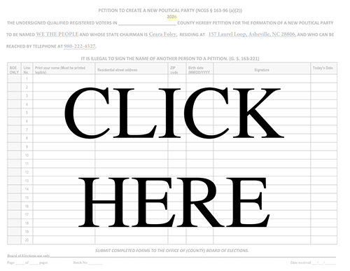 Complete the form with your information and provide your original handwritten signature. You may ask family members and friends to sign as well. Before anyone signs, you must inform them that the general purpose and intent of this petition are to qualify We The People NC as an officially recognized political party in North Carolina so that it may nominate candidates and have those candidates appear on the ballot in future elections. Anyone signing the same petition sheet must be a registered voter in the same county. If someone lives in a different county, they should download and complete their own copy of the petition separately.